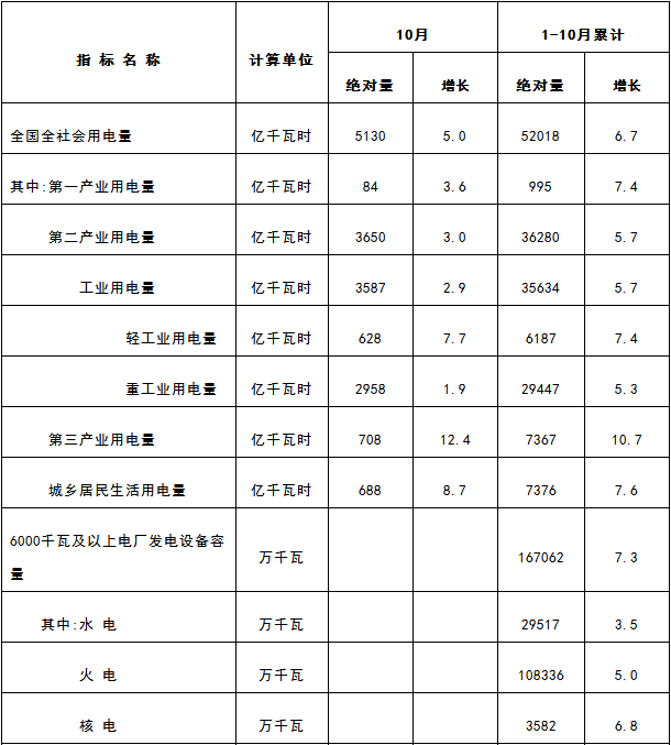 1-10月份,全國(guó)全社會(huì)用電量52018億千瓦時(shí),同比增長(zhǎng)6.7%。10月份,全國(guó)全社會(huì)用電量5130億千瓦時(shí),同比增長(zhǎng)5.0%。